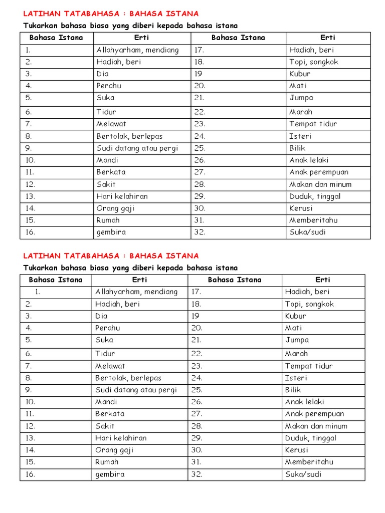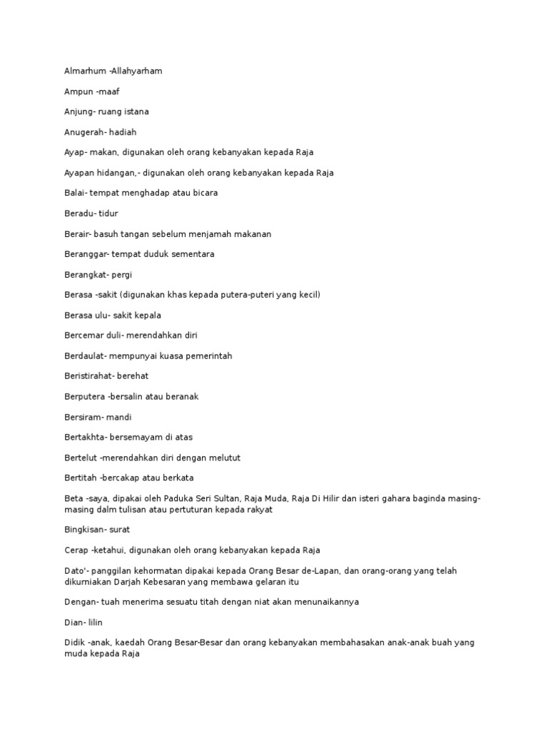 Bahasa istana berjalan berkata bersetuju bertolak/berlepas isteri kerusi makan mandi marah mati memberikan menghadiahkan menjumpai sakit suka/sudi tempat tidur tenang tidur ulang tahun.